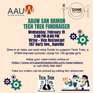 Virtue+Vice supports local non-profits by generously donating 10% of the evening’s proceeds and 100% of the tips to AAUW San Ramon Tech Trek.