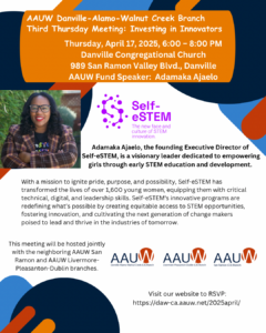 In a joint meeting with the Danville-Alamo-Walnut Creek and Livermore-Pleasanton-Dublin branches, we present this exciting program featuring AAUW Fund Community Action Grant recipient, Adamaka Ajaelo.