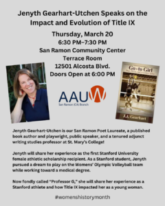Jenyth Gearhart-Utchen is our San Ramon Poet Laureate, a published book author and playwright, public speaker, and a tenured adjunct writing studies professor at St. Mary’s College!
