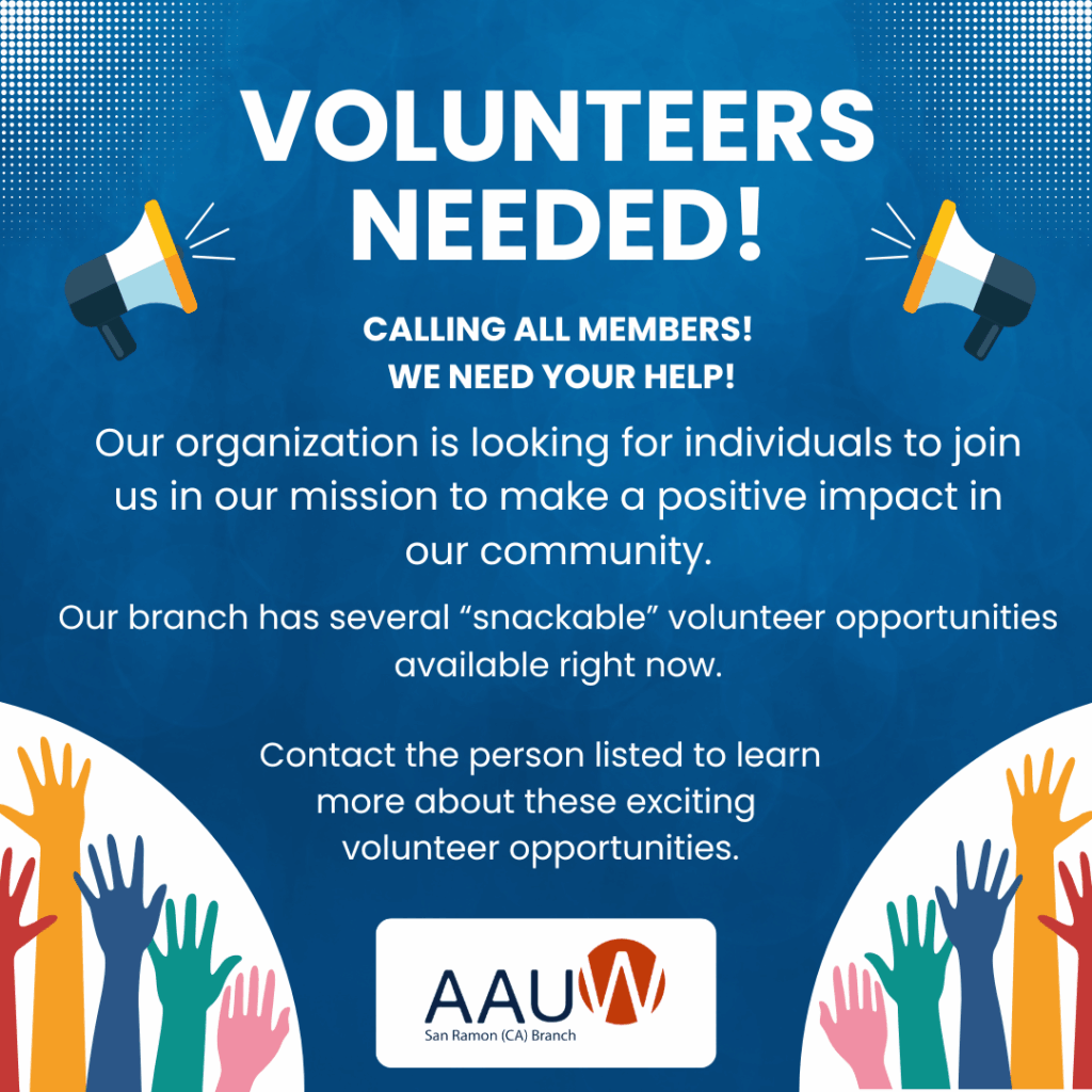 When you email Dan let him know that you are from AAUW San Ramon. Get your partner or a friend to sign up with you. It’s great fun. AAUW San Ramon volunteers are greatly appreciated and help Quest bring its family-friendly science exploration to our local community.
